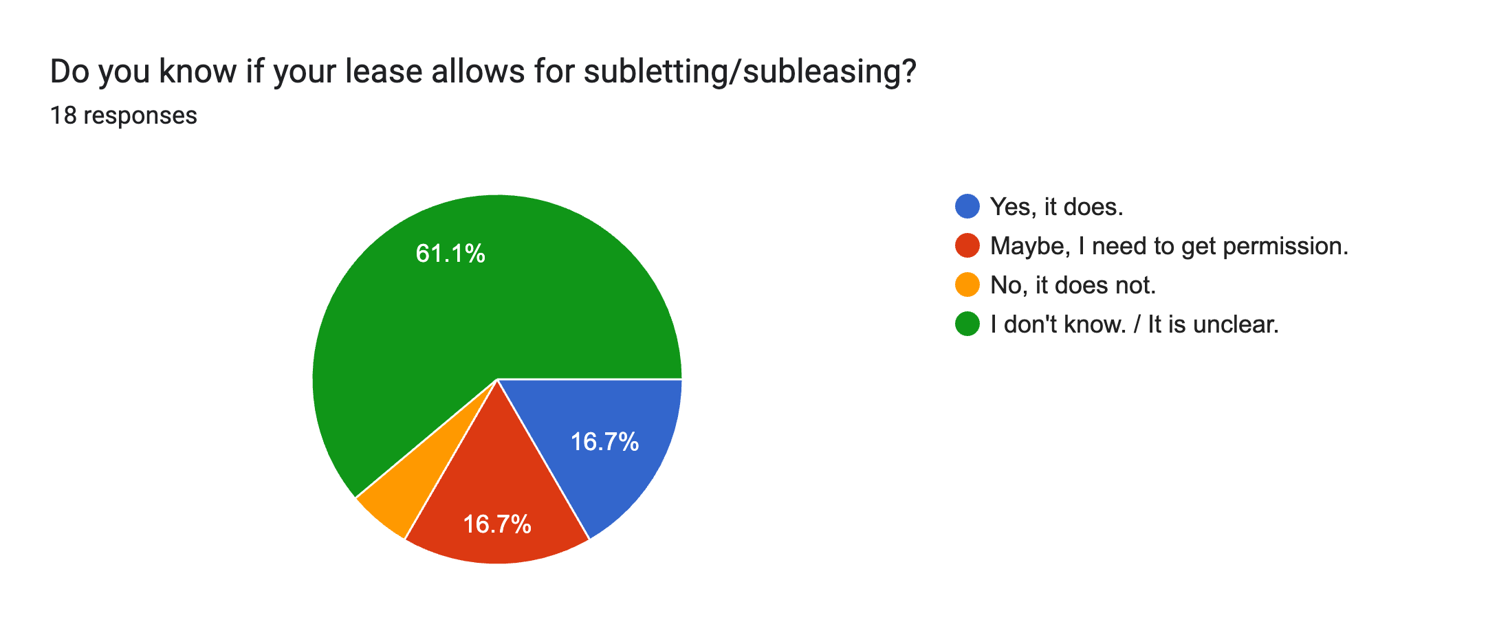 More than half of you do not know if your lease allows for subletting/subleasing. This ambiguity creates friction for anyone considering listing their place. We know firsthand because it has kept us from listing our own places. To solve this problem, we are considering launching a simple webpage where people can upload their lease and we will let them know their landlord’s sublet/sublease policy in simple terms with some suggestions on how best to navigate subletting their place.