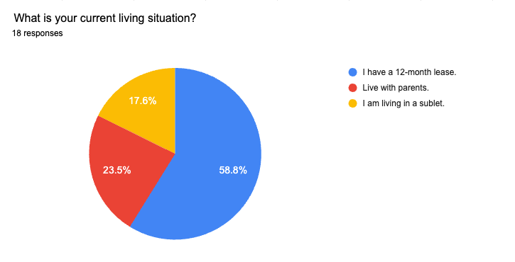 We were curious to learn about your current living situations. The majority of you are currently signed to a 12-month lease (59%). Almost a quarter (24%) of you are living at home with parents. We believe living at home is going to have enduring appeal for young people because they can save money for most of the year while still traveling to other places whenever they want by subletting.